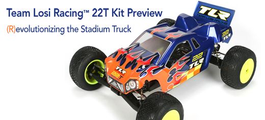 Team Losi Racing completely changed the landscape of 1/10-scale electric off-road racing in December of 2010 with the debut of the 22 2WD Buggy. From its aluminum chassis, sliding rack steering system, big bore shocks and mid- or rear-motor configuration, the 22 RC Buggy was dramatically different than anything else out there. Team Losi Racing has had a tradition of bringing out a buggy first, followed by a stadium truck shortly thereafter. Fast-forward 8-short months and Team Losi Racing is at it once again, this time bringing 22-style tech to the 1/10-scale Stadium Truck class with the new 22T.